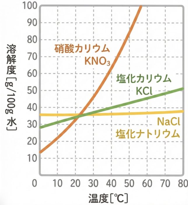 硝酸カリウムKNO₃は、温度が上がるにつれて溶解度が急激に大きくなることがわかる。一方、塩化カリウムKClは温度とともに溶解度は増加するが、その変化は比較的ゆるやかである。さらに、塩化ナトリウムNaClは温度が変わっても溶解度がほとんど変化しない。このように、溶解度の温度変化の大きさは物質によって異なる。溶解度曲線を用いることで、ある温度で溶質が最大何g溶けるかを読み取ることができる。