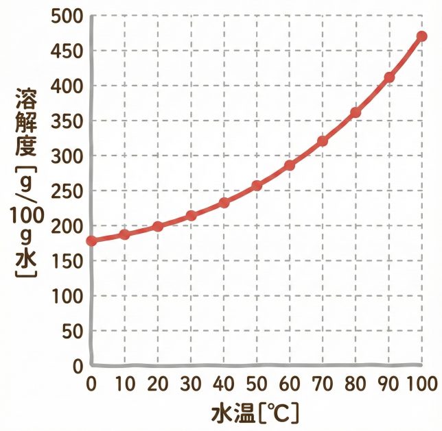 これはスクロースの「溶解度曲線」というグラフだ。横軸が温度、縦軸が溶解度となっている。「スクロース」というのは、お砂糖のことだと思ってくれればいい。