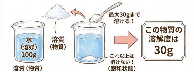 溶解度の基準は、考えやすくするために、溶媒(水)の量は「100g」とすることが多い。例えば、100gの水に最大で30g溶ける物質があったら、その物質の溶解度は30gと言えば良い。