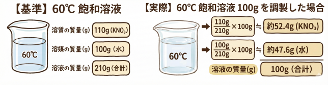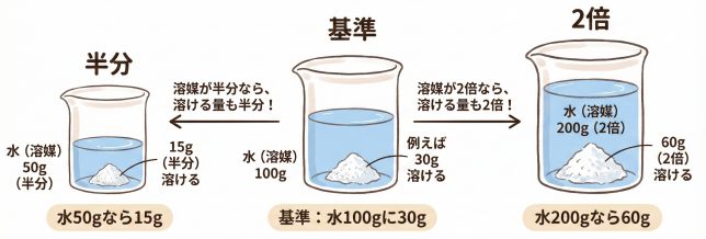 「水100gに30g溶ける(溶解度)」を基準とし、水が半分の50gなら溶ける量も半分の15g、水が2倍の200gあれば、溶ける量も2倍の60gとわかる。