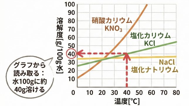図から、40°Cの水に溶ける塩化カリウムKClの溶解度を読み取ると、だいたい40gですね。