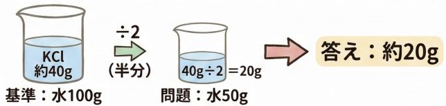 今回は水が50gだから、グラフの基準(100g)の半分です。だから、溶解度も半分の20gになるはずです!
