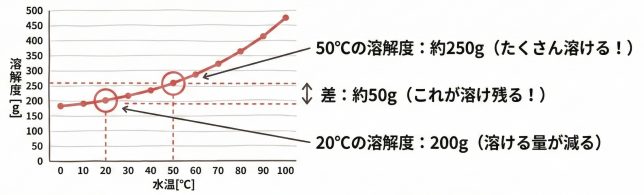 50℃のときに200gを超えて砂糖を溶かすと、冷やしたときに、溶け切れなくなって、再び溶け残りが結晶として出現するんだ。