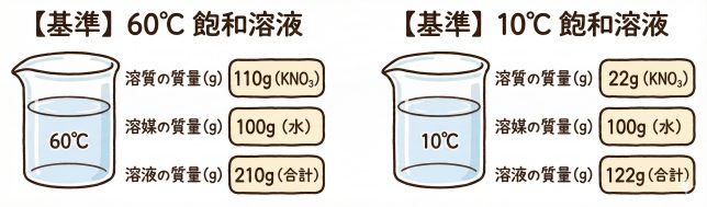 さて、このとき、溶質は一部が結晶となって析出しちゃうけれど、溶媒の水の量は10℃まで冷やしても47.6gのまま変わらないはずだ。