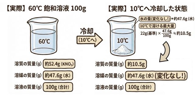 【実際】の溶液中には、【溶質(KNO3)】が52.4g、【溶媒(水)】が47.6gとなりますね。…ふぅ。この後どうすればいいんでしょう。