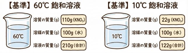 わかりにくかったら、図でまとめてみようか。硝酸カリウムは水100gに、10°Cで22g、60°Cで110g溶けるとする。のところを図にするとこんな感じかな。